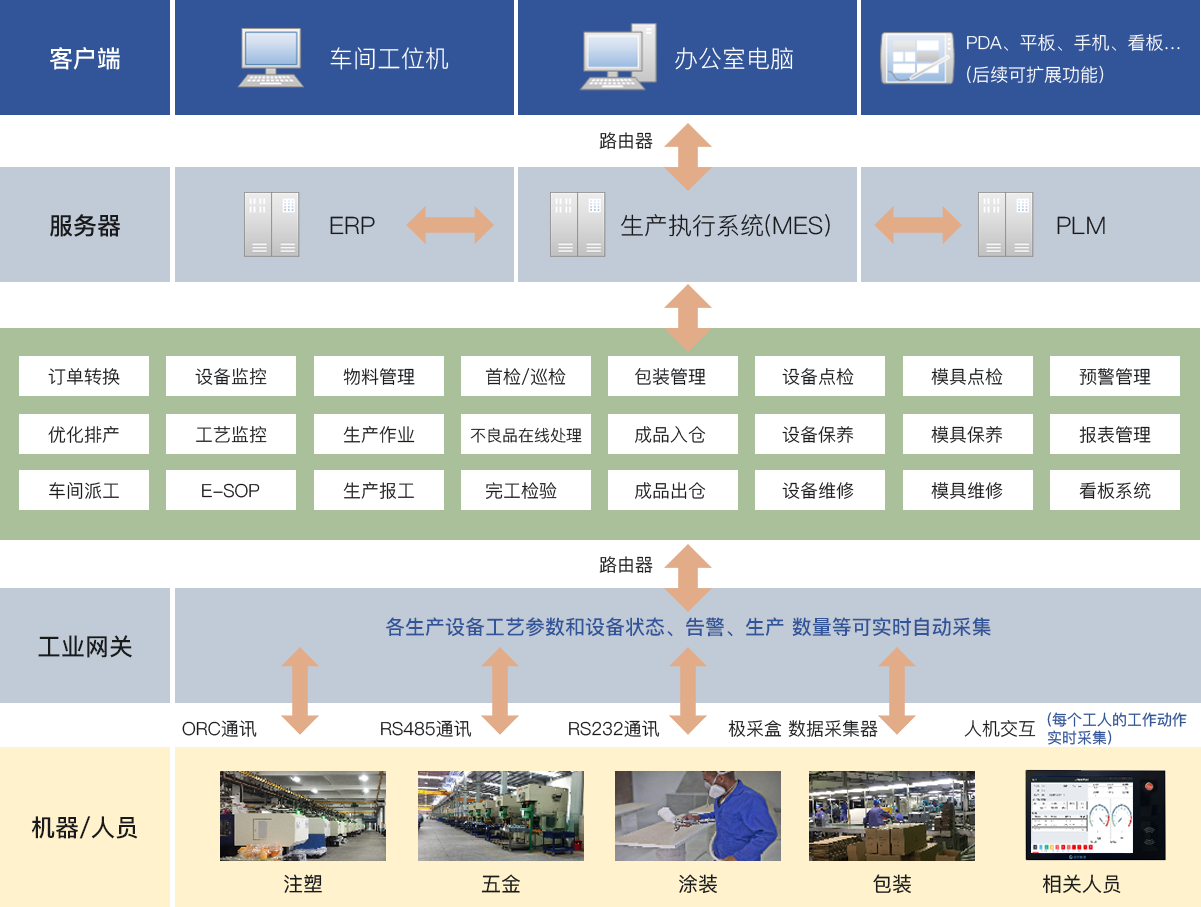 实现了工艺信息、物料信息、注塑机设备及摸具、人员信息、质量信息、生产进度、计划管理等系统化采集与管理,数据处理能够实时化、系统化,生产管理层可实时掌控生产状态,保证决策时效性